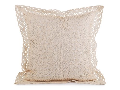 Obliečky na vankúše s paličkovanou čipkou dodajú vintage alebo boho atmosféru každému interiéru. Na zadnej strane sa zapínajú na zips. Predná strana vankúša je s čipkou, zadná je jednofarebná. Čipka presahuje cez okraj textilného poťahu. Toto je obliečka na vankúš, výplň môžete kúpiť zvlášť. Textilný poťah (rozmery na výplň vankúša) sú 45 x 45 cm. Celkové rozmery vankúša, vrátane čipky na okrajoch sú 55 x 55 cm.