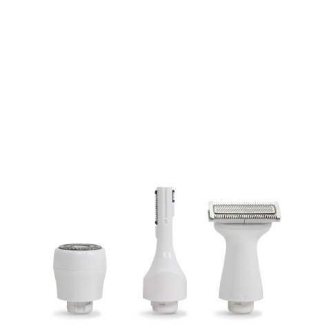 Systém obsahuje nástavce na holenie bikín a tela, zastrihávač pre detaily a odstraňovač chĺpkov na tvári Nástavce je možné ľahko vymieňať Strojček disponuje dvojitými čepeľami Na prevádzku potrebujete dve AAA 1,5V batérie Batérie nie sú súčasťou balenia