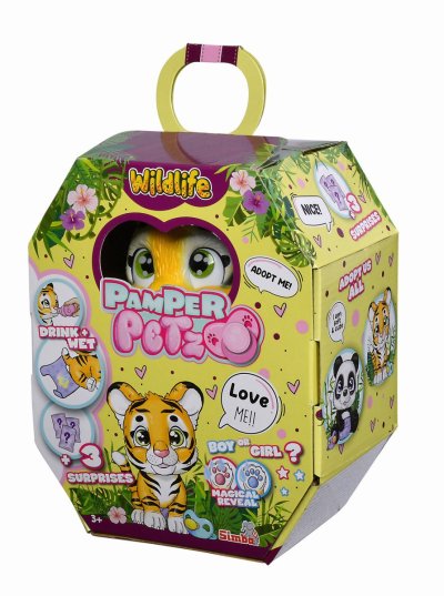 Roztomilé tigrie mačiatko s picou a cikacou funkciou, plienka s funkciou zmeny sfarbenia po namočení, magická labka (po navlhčení sa vyfarbí a ukáže pohlavie mačiatka), adopčný list a tri prekvapenia. Veľkosť 15 cm.