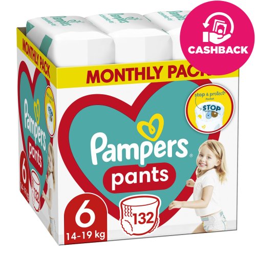 Veľkosť 6 132 kusov 13 - 19kg Poskytujú trojnásobnú ochranu so systémom Stop & Protect 2× širšie manžetky, ktoré pomáhajú predchádzať pretečeniu po stranách Vrecko, ktoré pomáha predchádzať pretečeniu vzadu Komfortná ochrana 360° Vrecko Stop & Protect pomáha zabrániť pretečeniu vzadu Ochrana 360° absorpčným jadrom, ktoré okamžite absorbuje tekutinu Jednoduchá výmena plienkových nohavičiek Sú schválené dermatológmi z organizácie Skin Health Alliance ako bezpečné pri kontakte s detskou pokožkou Používajte spoločne s detskými čistiacimi obrúskami Pampers