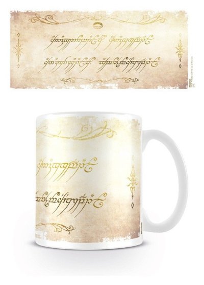 Keramický hrnček s objemom 325 ml je venovaný fanúšikom kultovej ságy Pán prsteňov. Hrnček je vyrobený z kvalitnej bielej keramiky a jeho povrch je pokrytý potlačou pripomínajúcou starobylý pergamen s ikonickým elvským písmom, ktoré je typické pre legendárny Prsteň moci. Dizajn kombinuje jemné zlaté a hnedé tóny, ktoré vytvárajú historický a mystický dojem, a tým dokonale ladia s témou fantasy sveta Stredozeme.