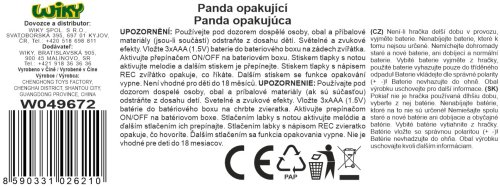 Panda opakujúca svietiaca 21cm. Batérie 3xAAA nie sú súčasťou. Stlačením labky s notou hrá pesničky. Ďalším stlačením pesničku vypne, ďalšie stlačenie spustí ďalšiu pesničku. Celkom 5 rôznych pesničiek. Stlačením labky s nápisom REC nahrá zvuk, ktorý okamžite zopakuje. Ďalším stlačením sa opakovanie a nahrávanie vypne. Batérie sú umiestnené na chrbte zvieratka za suchým zipsom. Prepínač on/off je umiestnený na krabičke na batérie. Vždy keď je zapnuté nahrávanie, alebo pesničky, bliká zvieratko farebne.