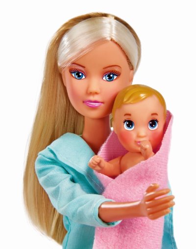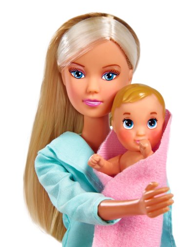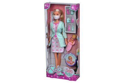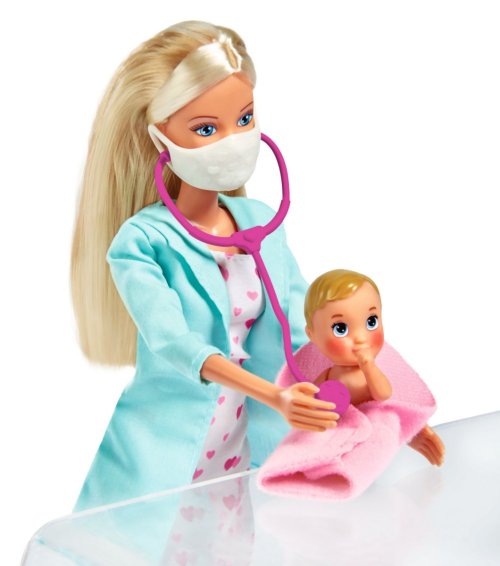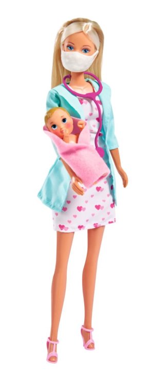 Bábika Steffi ako detská lekárka so zdravotníckou tvárovou maskou a množstvom doplnkov. Súčasťou bábätko, ktorému sa pri teplote nad 31 ° C mení sfarbenie tvárí. Veľkosť bábiky 29 cm.