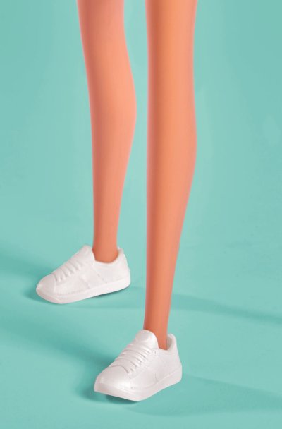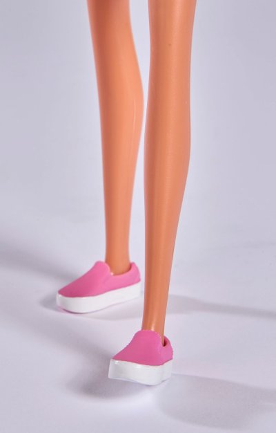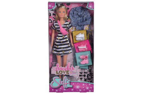 Bábika Steffi v módnych šatách s džínsovou bundou, ľadvinkou a tromi pármi tenisiek. Veľkosť bábiky 29 cm.