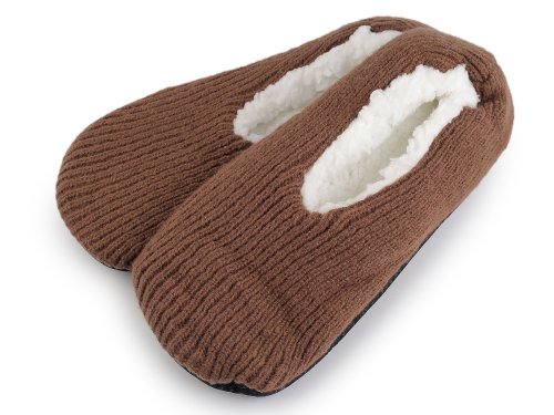 V domácej obuvi s kožúškom si užijete pravú pohodu. Z vrchnej strany je [pletenina], vo vnútri je teplá chlpatá podšívka, ktorá verne imituje vlnu. Protišmykové gumové bodky na chodidle zabránia pošmyknutiu. Upozorňujeme zákazníkov, že zloženie na štítkoch sa môže líšiť, materiál je akryl, polyester a polyamid.