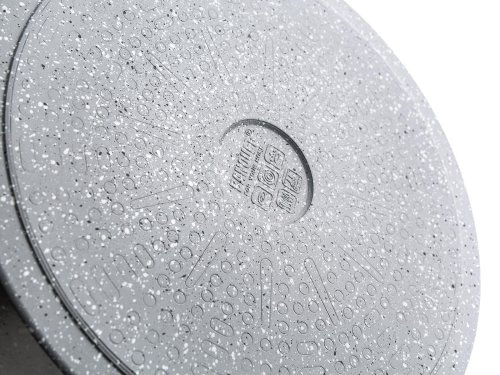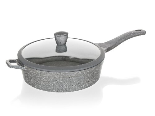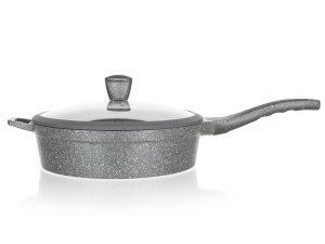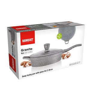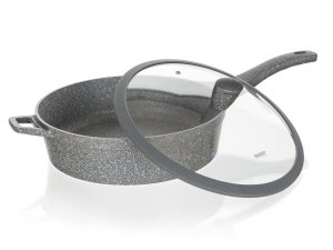 Hliníková hlboká panvica MARRONE s priemerom 28 cm je opatrená vnútorným nepriľnavým povrchom, ktorý zabraňuje pripaľovaniu jedál pri varení. Panvica je vybavená sklenenou pokrievkou s knobom so silikónovým povrchom, ktorý zaisťuje ochranu proti popáleniu pri varení. Ergonomická rukoväť so soft-touch povrchovou úpravou zaručuje ľahkú manipuláciu. Dno panvice je ošetrené žiaruvzdorným granitovým nástrekom. Panvica je dodávaná v šedej farbe s granitovým dekórom.