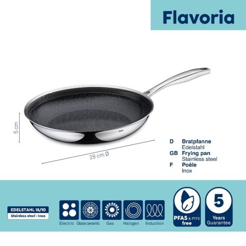 Objavte novú hviezdu vašej kuchyne! Panvica Flavoria z nerezovej ocele v sebe spája eleganciu, odolnosť a špičkovú funkčnosť . Vďaka unikátnej voštinovej štruktúre a keramickému nepriľnavému povrchu sa stane vašim každodenným pomocníkom, na ktorého sa môžete spoľahnúť.