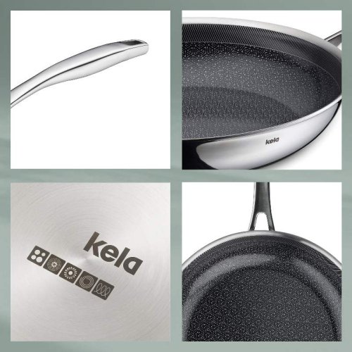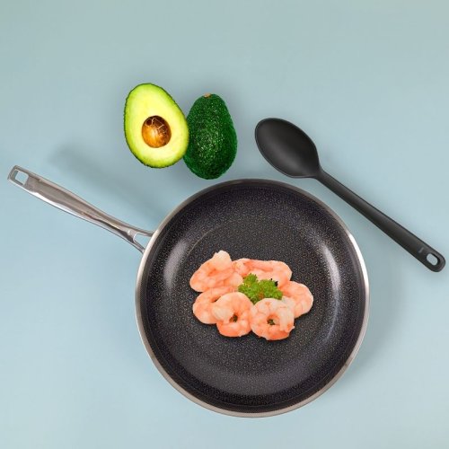 Ochranná vrstva odolná proti poškriabaniu umožňuje použitie kovového kuchynského náčinia bez obáv z poškodenia. Trojvrstvové telo riadu kombinuje nerezovú oceľ s hliníkovým jadrom na optimálne rozloženie tepla až do okrajov nádoby.