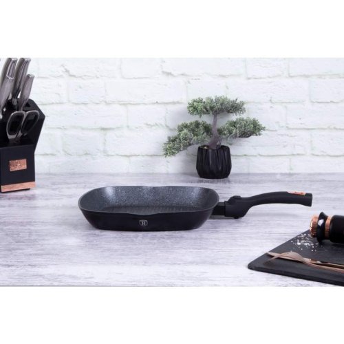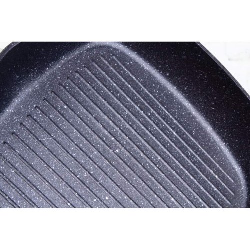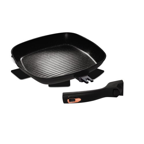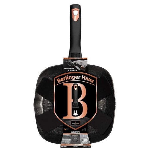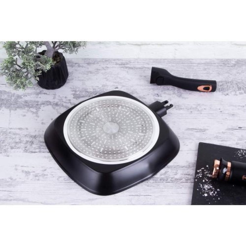 Grilovacia panvica s nepriľnavým povrchom s mramorovým dizajnom a odnímateľnou rukoväťou v atraktívnom dizajne Black Rose Collection. Panvica je potiahnutá 3vrstvovým mramorovým povrchom, ktorý je charakteristický svojou dokonalou nepriľnavosťou, potraviny sa nepripaľujú a vďaka tomu sa panvica veľmi jednoducho čistí. Zároveň je vhodný na zdravé varenie s minimom tuku alebo oleja, v závislosti na použitých surovinách pokojne aj bez jedinej kvapky tuku. Jedným stlačením tlačidla je možné odnímateľnú rukoväť z panvice zložiť a tú potom vložiť na dopekanie alebo rovno na pečenie do rúry. Nasadenie a odobratie rukoväte zvládnete jednoducho jednou rukou. Iste to oceníte aj pri skladovaní alebo údržbe.