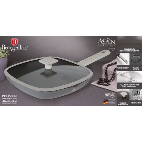 Grilovacia panvica s titánovým povrchom v šedom dizajne Aspen Collection. Moderný minimalistický dizajn panvice vás určite zaujme hneď na prvý pohľad. Matný šedý povrch panvice je navyše veľmi praktický pri dlhodobom používaní. Vnútorná vrstva je potiahnutá 3-vrstvovým titánovým povrchom, ktorý je charakteristický svojou dokonalou nepriľnavosťou. Pripravované pokrmy sa tak nepripaľujú a vďaka tomu sa panvica veľmi ľahko čistí. Zároveň je vhodný na zdravé varenie s minimom tuku alebo oleja, v závislosti na použitých surovinách pokojne aj bez jedinej kvapky tuku. Titánový povrch, rovnako ako ostatné použité materiály, neobsahujú žiadne škodlivé látky, varenie je tak úplne zdravé a hygienické. Zosilnené Turbo indukčné dno z nerezovej ocele je kompatibilné so všetkými druhmi varných dosiek a spoľahlivo funguje aj na indukcii. Iste oceníte tepelne izolovanú rukoväť, ktorá sa pri varení nezahrieva a zostáva stále chladná. panvica Aspen je vhodná na každodenné varenie, dusenie aj vyprážanie, perfektne bude vyzerať aj pri servírovaní hotových jedál priamo na váš stôl.