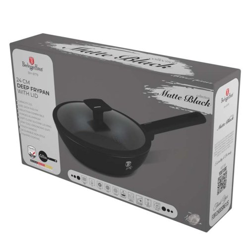 Táto hlboká panvica s pokrievkou je vyrobená z kovaného hliníka s nepriľnavou vrstvou TitanPro, ktorá zaisťuje vysokú kvalitu a odolnosť. Panvica má priemer 24 cm, výšku 6,5 cm a objem 2,3 litra. Matná čierna farba a minimalistický štýl dodávajú panvici moderný vzhľad. Ergonomická mäkká rukoväť a úchyt pokrievky zaisťujú pohodlné a bezpečné používanie. Pokrievka je vyrobená z tvrdeného skla so silikónovým systémom Soft Close odolným proti teplu a otvorom na odvod pary.