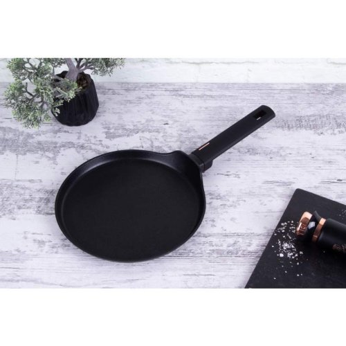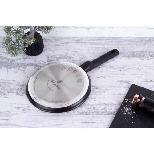 Panvica na palacinky s titánovým povrchom v šedom dizajne Monaco Collection. Moderný minimalistický dizajn panvice vás určite zaujme hneď na prvý pohľad. Matný béžový povrch panvice je navyše veľmi praktický pri dlhodobom používaní. Vnútorná vrstva je potiahnutá 3-vrstvovým titánovým povrchom, ktorý je charakteristický svojou dokonalou nepriľnavosťou. Pripravované pokrmy sa tak nepripaľujú a vďaka tomu sa panvica veľmi ľahko čistí. Zároveň je vhodný na zdravé varenie s minimom tuku alebo oleja, v závislosti na použitých surovinách pokojne aj bez jedinej kvapky tuku. Titánový povrch, rovnako ako ostatné použité materiály, neobsahujú žiadne škodlivé látky, varenie je tak úplne zdravé a hygienické. Zosilnené Turbo indukčné dno z nerezovej ocele je kompatibilné so všetkými druhmi varných dosiek a spoľahlivo funguje aj na indukcii. Iste oceníte tepelne izolovanú rukoväť, ktorá sa pri varení nezahrieva a zostáva stále chladná. panvica Matte Black je vhodná na každodenné varenie, dusenie aj vyprážanie, perfektne bude vyzerať aj pri servírovaní hotových jedál priamo na váš stôl.