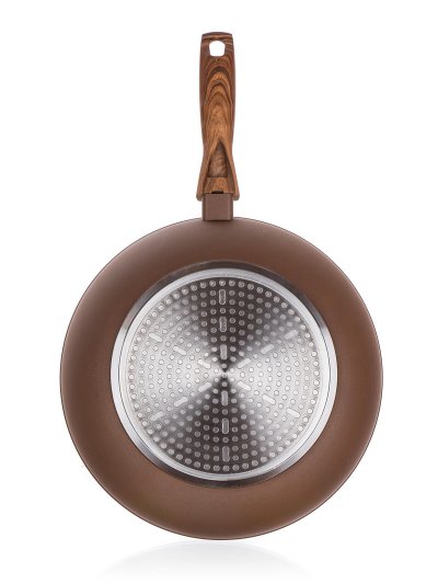 Kovaná hliníková WOK panvica SMART STONE BRICK, s bakelitovou rukoväťou so soft touch povrchovou úpravou, v imitácii prírodného dreva. Panvica má dvojvrstvový vnútorný nepriľnavý povrch v štruktúre riečneho kameňa, indukčné dno a je opatrená vonkajším žiaruvzdorným nástrekom.