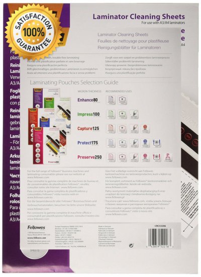 Čistiaci papier vo formáte A4 (možno použiť aj pre A3) značky Fellowes predstavujú kvalitný výrobok určený na čistenie laminátorov. Na valcoch prístrojov na lamináciu zostávajú drobné nečistoty a malé čiastočky fólií. Nechajte prejsť čistiaci list a všetka špina zostane nalepená na ňom.