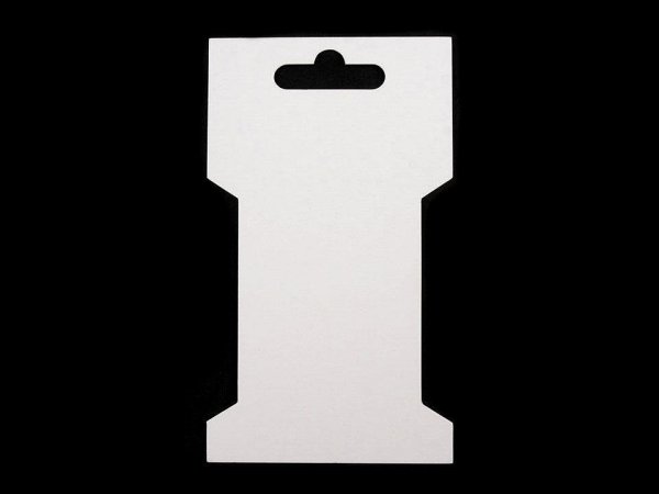 Karta s výsekom na zavesenie široká 6,6 cm, dlhá 11,5 cm. Hore má výsek na zavesenie. Vykrojenie na stranách môžete využiť na rozmeranie a navinutie stuh, paspuliek, šikmých prúžkov a pod. Šírka úzkeho stredu je 5 cm. Karta je vhodná na vystavenie gumičiek a sponiek. Je vyrobená z tvrdého papiera.