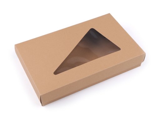 Papierová krabica má trojuholníkový výrez vo veku z priehľadnej fólie. Využijete ju na balenie darčekov, šatiek, rukavíc a pod. Môžete si ju aj dozdobiť podľa svojho vkusu. Škatuľu dodávame v rozloženom stave (horné veko - 30 x 40 cm, spodná časť krabice - 36 x 46 cm). Zložíte si ju jednoducho podľa vyznačených ohýbacích krajov. Rozmer priehľadu je 9 x 16,5 cm. Pripravili sme pre vás foto návod na skladanie krabičky.