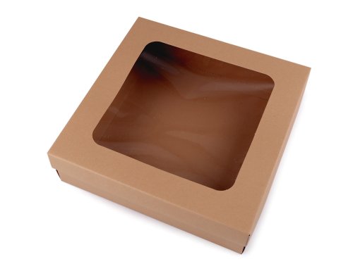 Papierová krabica natural má výrez vo veku s priehľadnou fóliou. Využijete ju na balenie darčekov, veľkých šatiek, tričiek, košieľ, uloženie menších vianočných dekorácií a pod. Môžete si ju aj dozdobiť podľa svojho vkusu. Škatuľu dodávame v rozloženom stave (horné veko - 42 x 42 cm, spodná časť krabice - 55 x 55 cm). Zložíte si ju jednoducho podľa vyznačených ohýbacích krajov. Rozmer priehľadu je 18 x 18 cm. Pripravili sme pre vás foto návod na skladanie krabičky.