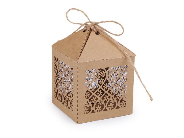 Papierová krabička v prírodnom štýle má vyrezávaný filigránový design. Papierové krabičky vám poslúžia na uschovanie malých drobností a sladkostí pre svadobných hostí (svadobných mandlí, praliniek, luxusných čokoládiek, cukríkov a pod.). Využijete ich aj na aranžovanie slávnostných tabúľ počas osláv. Krabičku dodávame v rozloženom stave. Zložíte ju jednoducho podľa vyznačených ohýbacích krajov.