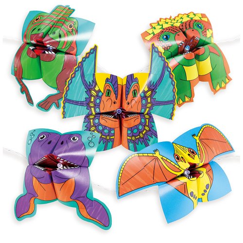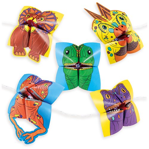 Reťaž rozjasní izbu každého fanúšika dinosaurov! Vyfarbite listy papiera z dinosaurích origami a podľa pokynov krok za krokom ich poskladajte. Potom pridajte samolepky, časti tela a pomocou sponiek ich pripevnite k svetlám pre prehistorickú svetelnú show!