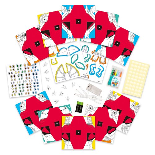 Obsah: 10 listov papierov s origami, 2 listy - časťou tela dinosaurov, šnúra 10 LED svetiel s batériou, 2x AA batérie, 10 spôn, 6 mini vláknových pier, samolepka, lepiace kruhy a sprievodca