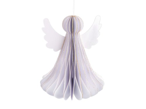 Závesná dekorácia v tvare anjela je vyrobená z plástvového papiera, ktorý pri roztiahnutí vytvára efekt pripomínajúci včelie plásty. Tento druh papiera má zaujímavý 3D efekt. Anjel má pútko na zavesenie, ale vďaka širokej základni aj výborne stojí. Tvar anjela skvele drží vďaka magnetom, ktoré sú vo vnútri. Na hranách papiera sú trblietavé glitre.