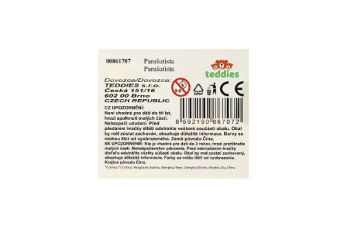 Plastová postavička parašutistu s padákom. Táto hračka určite poteší každého malého dobrodruha. Behaj a vyhadzuj parašutistu do najväčšej výšky, prekonávaj dĺžku jeho letu! Pri páde sa padák nafúkne a spomalí pád panáčika - ako skutočný parašutista! Rozmer figúrky: 9 cm Rozmery balenia: 5 x 15 x 5 cm Vhodné pre deti od 3 rokov