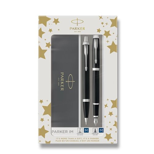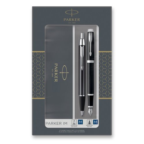 Plniace pero:, * nasadzovacie viečko, * hrot M, * dvojkanálkový systém zásobovania hrotu atramentom, * prispôsobené výhradne na používanie atramentových bombičiek Quink alebo konvertora (nie je súčasťou balenia), Guľôčkové pero (propiská):, * stláčací mechanizmus, * dodávané s modrou náplňou. Dodávané v darčekovej kazete. (Podoba balenia podľa skladovej dostupnosti)., TIP: K plniacemu peru by ste mohli využiť konvertory Parker s fľaštičkovým atramentom alebo atramentové bombičky Quink., TIP: Kúpte si rovno aj náhradnú náplň Parker do guličkového pera., TIP: Ako vyčistiť plniace pero?, Parker . Je elegantný aj vysoko profesionálny a spoľahlivý. Ponúka odolný hrot z ušľachtilej nerezovej ocele, širokú paletu prevedení, inšpirovaných tradíciou značky Parker, užívateľské pohodlie i maximálnu výkonnosť., AKO SA LÍŠIA HROTY FAM?, F - Slabý hrot (Fine) - Vhodný pre bežné písanie a poznámky. Mierny tlak vytvára jemnú linku. Veľmi obľúbený, vhodný pre užívateľov so štandardným rukopisom., M - Stredný hrot (Medium) - Priemerný tlak a šírka linky. Vhodný pre užívateľov, ktorí majú radi maličko silnejšiu linku.