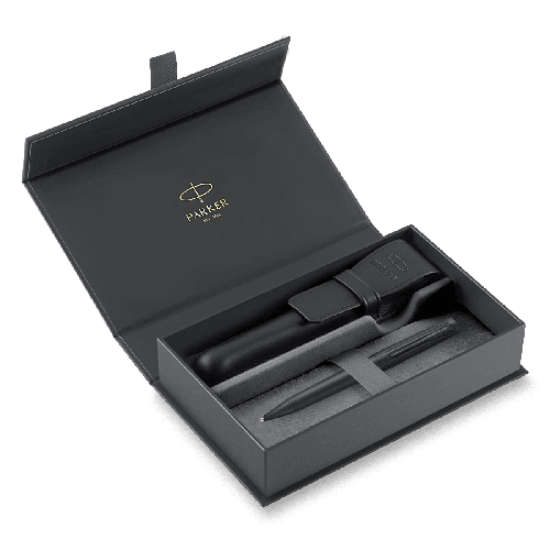 Darčeková kazeta obsahuje:, * guličkové pero Parker Ingenuity Black BT, * čierne kožené puzdro Parker, * voucher Akadémia písania