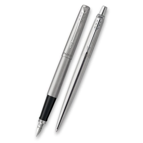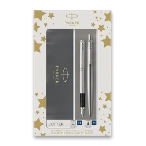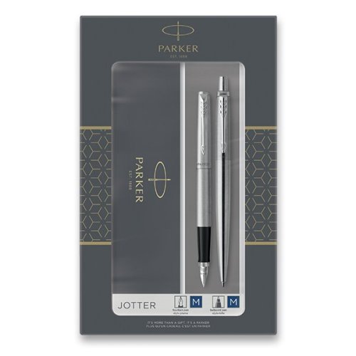 Plniace pero:, * nasadzovacie viečko, * hrot M, * dvojkanálkový systém zásobovania hrotu atramentom, * hrot z nerezovej ocele, * prispôsobené výhradne na používanie atramentových bombičiek Quink alebo konvertora (nie je súčasťou balenia), Guľôčkové pero (prepiská):, * stláčacie mechanizmus, * modrá dostupnosti, Hrot o šírke 1,0 mm u plniaceho pera aj guličkového pera., Vyrobené vo Francúzsku. Dodávané v darčekovej kazete. (Podoba balenia podľa skladovej dostupnosti)., TIP: K plniacemu peru by ste mohli využiť konvertory Parker s fľaštičkovým atramentom alebo atramentové bombičky Quink., TIP: Kúpte si rovno aj náhradnú náplň Parker do guličkového pera., Parker Jotter je dizajnérskou klasikou a dôverou a priaznivý pomer ceny a výkonu. Jedná sa o nadčasový model, ktorý aj vďaka širokej ponuke povrchových prevedení a praktickému, jednoduchému tvaru patrí medzi najobľúbenejšie.