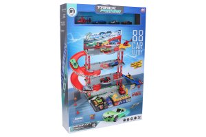 Parkovacia stanica s 3 kovovými autami a vrtuľníkom. Rozmery 59x27x39 cm. Veľkosť auta 7 cm. Stanica obsahuje 3 kovové autá, 1 kovový vrtuľník, heliport, čerpaciu stanicu, závoru.