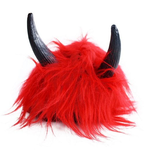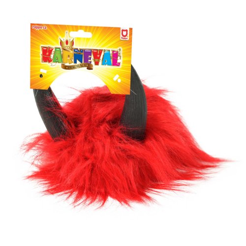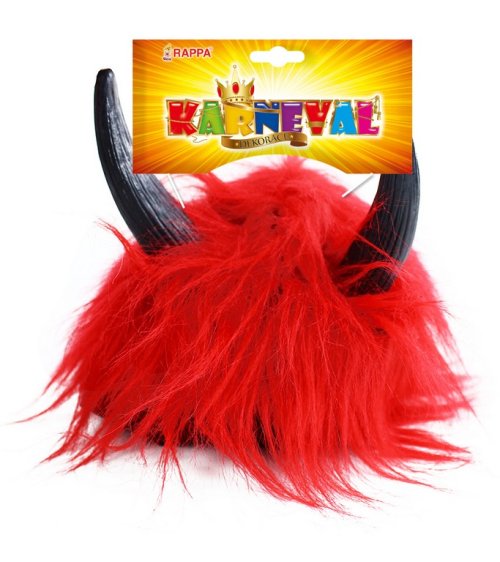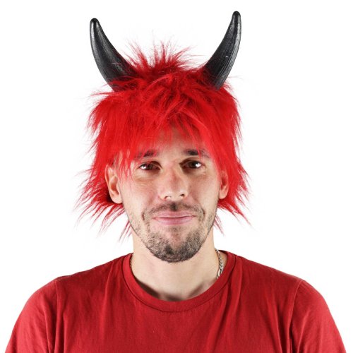 Karnevalová parochňa v motíve diabla. Parochňa má krátke červené vlasy, krátku ofinu a je dekorovaná rohmi.