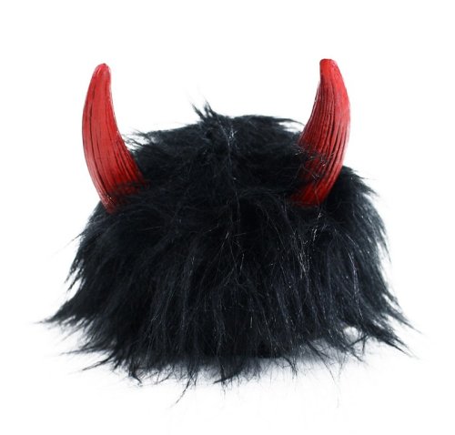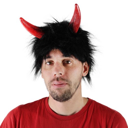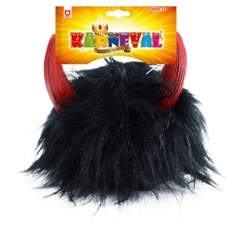 Karnevalová parochňa v motíve čerta. Parochňa má čierne vlasy, krátku ofinú a je dekorovaná čertými červenými rožkami.