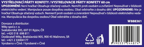 * Riziko udušení: Výrobek obsahuje malé části, které mohou děti spolknout. Uchovávejte mimo dosah malých dětí. * Riziko vznícení: Serpentiny a konfety mohou být hořlavé. Je třeba se vyhnout kontaktu s otevřeným ohněm a jinými zdroji tepla. * Riziko alergií: Některé serpentiny a konfety mohou obsahovat barviva, která mohou u některých lidí vyvolat alergické reakce. Pokud se objeví alergická reakce, okamžitě přestaňte používat. * Riziko poškození očí: Při používání konfet je třeba dbát opatrnosti, aby se zabránilo vniknutí do očí. * Riziko uklouznutí: Po použití serpentin a konfet je třeba je uklidit, aby se zabránilo riziku uklouznutí. * Likvidace: Použité serpentiny a konfety je třeba likvidovat v souladu s místními předpisy.