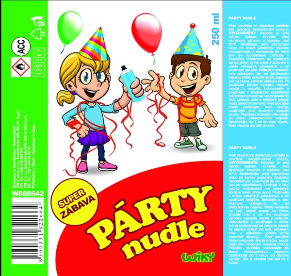Rezance v spreji, čiže špagety v spreji nesmú chýbať na žiadnej zábave a párty. Vyberte obľúbenú farbu a rozbehnite to! Pri stlačení spúšte sa zo spreja vylúči tenký prúžok farebnej peny, ktorá okamžite schne. Po zaschnutí je možné zobrať väčšie kusy zo zeme. Ideálne je použitie na vonkajších párty akciách. Na niektorých textíliách môže zanechávať stopy. Prosím dodržujte bezpečnostné pokyny na fľaštičke. Objem 250ml. Rozmery výrobku 17cm. Vhodné pre deti od 8 rokov.