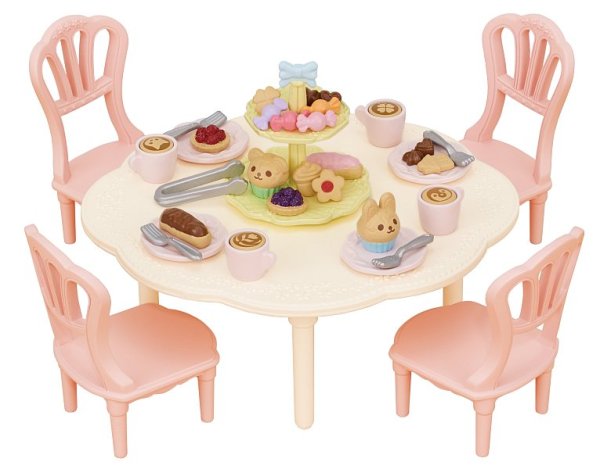 Sada Stôl, stolička a množstvo sladkostí skladá zo stola, štyroch stoličiek, riadu a pochúťok pre 4 osoby, vrátane hrnčekov s kávou, koláčov a ďalších sladkých pochúťok. Obsahuje celkom 30 rôznych doplnkov. Stojan na tortu je ideálny na usporiadanie lahôdok a vystavenie tort a sladkostí. Originálne doplnky a nábytok hodí do všetkých chát Sylvanian Families. Hračky Sylvanian Familes vyrába japonská firma Epoch už viac ako 35 rokov. Vyznačuje mimoriadnou kvalitou a dôrazom na detail. Kombinujte s ďalšími figúrkami, domami a nábytkom Sylvanian Families pre ešte viac zábavy a kreatívneho hrania (sady predávajú samostatne