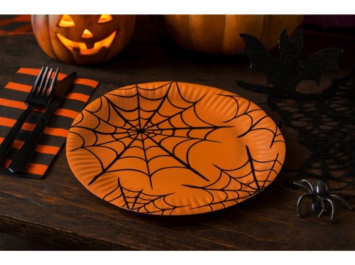 Farebné papierové tanieriky s hravým halloweenskym motívom duchov, tekvíc a netopierov dodajú vašej oslave tú správnu strašidelnú atmosféru. Ideálne na detské party, školské akcie alebo domáci Halloween. Balenie obsahuje 8 ks tanierikov s priemerom 23 cm. Jednorazové a praktické.