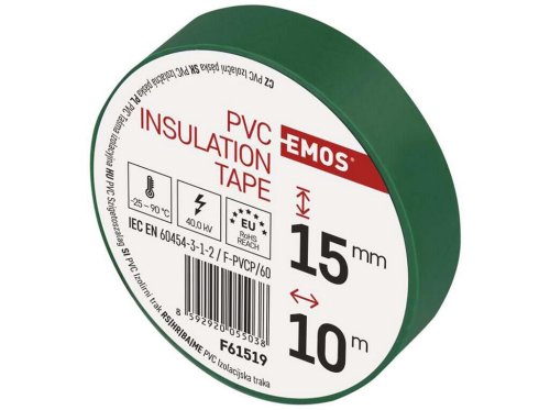 šírka: 15 mm dĺžka: 10 m hrúbka: 0,13 mm materiál: PVC farba: zelená pevnosť v ťahu: 150 N/10 mm elektrická pevnosť minimálne: 40 kV/mm predĺženie minimálne: 125 % elektrická pevnosť po vlhku minimálne: 35 kV /mm skúška plameňom: priľnavosť k oceli minimálne: 1,8 N/10 mm priľnavosť k podkladu: 1,5 N/10 mm odporúčaná skladovacia teplota: 10–45 °C rozsah inštalačných teplôt: -25–90 °C spĺňa smernicu ROHS spĺňa smernicu REACH vyhovuje norme: STN EN 60454-3-1-2/F-PVC/60 odolné UV vodotesný spoj materiál lepidla: kaučuk predpokladané použitie: izolácia káblov samozhášavé