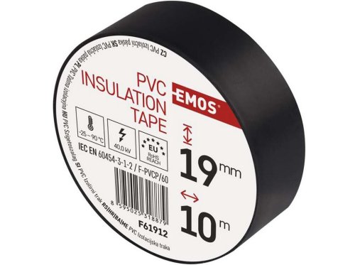 šírka: 19 mm dĺžka: 10 m hrúbka: 0,13 mm materiál: PVC farba: čierna pevnosť v ťahu: 150 N/10 mm elektrická pevnosť minimálne: 40 kV/mm predĺženie minimálne: 125 % elektrická pevnosť po vlhku minimálne: 35 kV /mm skúška plameňom: priľnavosť k oceli minimálne: 1,8 N/10 mm priľnavosť k podkladu: 1,5 N/10 mm odporúčaná skladovacia teplota: 10–45 °C rozsah inštalačných teplôt: -25–90 °C spĺňa smernicu ROHS spĺňa smernicu REACH vyhovuje norme: STN EN 60454-3-1 odolné UV vodotesný spoj materiál lepidla: kaučuk predpokladané použitie: izolácia káblov