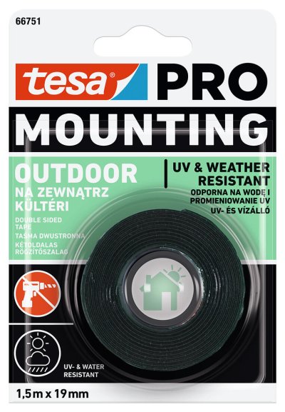 Páska tesa PRO Mounting Outdoor urýchľuje a uľahčuje remeselníkom prácu vo vonkajšom prostredí. Vďaka spoľahlivej a účinnej lepiacej sile výborne drží na náročnom povrchu (dlaždice, tehly, kov, tvrdé plasty). Zákazníkom tak môžete ponúknuť trvalé a bezpečné upevnenie dôležitých objektov (listovej schránky, čísla na domoch) pomocou pásky odolnej proti UV žiareniu, vlhkosti aj teplotným extrémom.