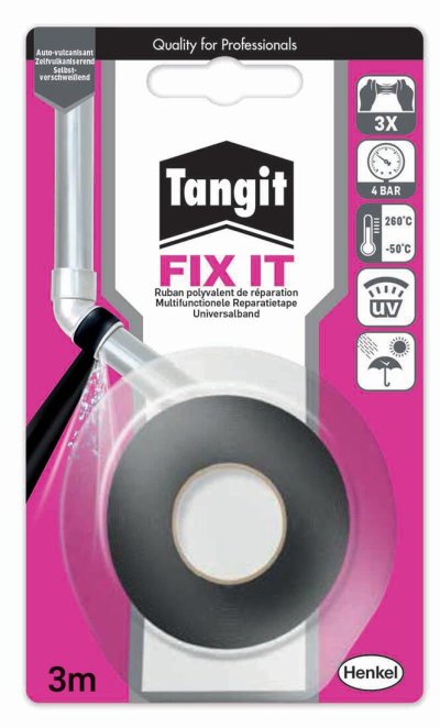 Tesniaca páska na báze silikónu na dočasné utesnenie. Odoláva tlaku do 4 bar. Odolná voči UV žiareniu. Odolná voči teplotám od – 50 °C do + 260 °C. Ihneď tesní, maximálnu pevnosť dosahuje po 24 hodinách. Tesniacu pásku je možné narezaním odstrániť bez zvyškov. Pozor, vďaka obmotávaniu je páska pod ťahovým napätím. Testované na PVC trubke s prasklinou 2 mm pri návine v 12 vrstvách. Odolnosť pre tlakové systémy do +90 °C. Tento produkt nesmie byť použitý na čistý kyslík alebo na kyslík bohaté systémy, na chlór alebo ďalšie silne okysličené materiály a tiež na palivo, naftu alebo vykurovací olej. Tesniaca páska Tangit FIX IT nie je vhodná na systémy, ktoré obsahujú glykoly (napr. niektoré nemrznúce zmesi v podlahovom kúrení).
