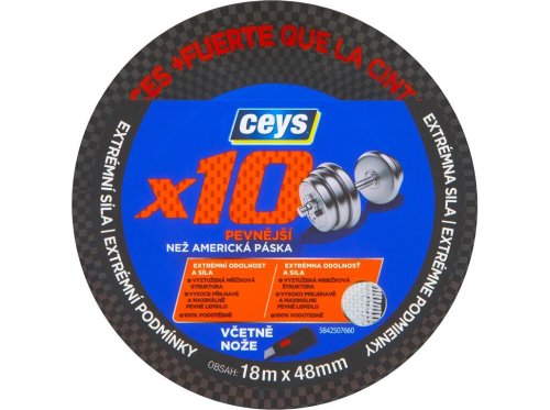 Páska PROFI priľne k drevu, plastu, kovu, kartónu, koži, koženke, kobercu, plachtovine, gume a to aj na nerovný povrch. Ceys Profesionálna páska x10 je 10-krát pevnejšia ako Americká páska. Táto opravná páska s vysokou priľnavosťou k širokej škále materiálov je určená pre extrémne podmienky. Je vystužená mriežkovou štruktúrou vlákien a je opatrená vysoko priľnavým a maximálne pevným lepidlom. Vďaka tomu je z mechanického hľadiska pevnejší. 100% vodotesná. Aplikovať na čisté a suché povrchy, zbavené prachu, mastnoty alebo všeobecne nečistôt pri teplotách od 0 do 50 °C. Nedotýkať sa prstami lepivej plochy pásky. Po odlepení nezostávajú na povrchu zvyšky lepidla. Je extrémne silná a nemožno trhať rukou, preto je súčasťou malý nožík. Požadovaný rozmer odrezať nožom priloženým k baleniu pásky.
