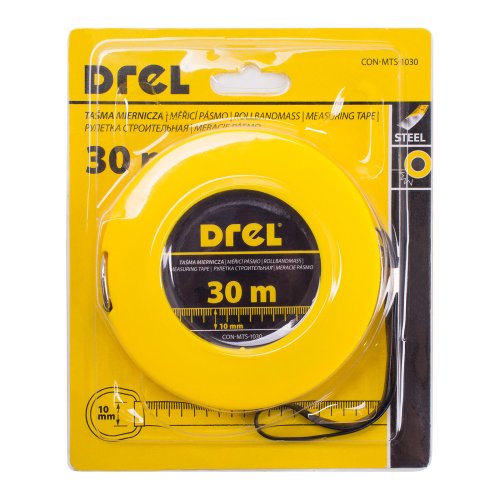 dĺžka pásma: 30 mšírka pásma: 10 mm Oceľové zvinovacie pásmo 30 m/10 mm Drel v odolnom tvrdenom puzdre so sklopnou navíjacou páskou.