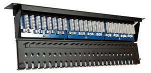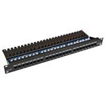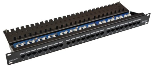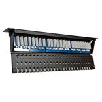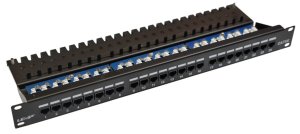 Patch panel 24 portov 1U CAT 5e UTP s pomocnou vyväzovacou poličkou a horným zárezom pre 19" rozvádzače. Zárezová svorkovnica typu "KRONE".