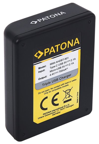 S nabíjačkou Patona Triple je možné nabíjať 3 batérie AHDBT901 alebo ADBAT001 súčasne , a to z akéhokoľvek USB výstupu. Disponuje konektormi micro USB a USB typu C. Nabíjačky sú vyrábané podľa najvyšších európskych štandardov kvality a vyznačujú sa extrémne dlhou životnosťou.