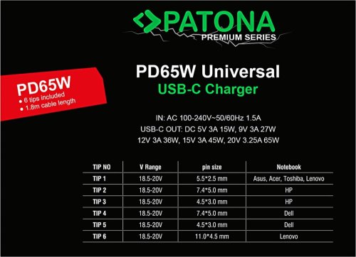 Univerzálny napájací zdroj pre notebooky ASUS, Acer, Toshiba, Lenovo, HP alebo Dell s maximálnym výkonom 65 W. Samozrejmosťou je ochrana proti prepätiu, skratu a stabilizátor výstupného prúdu. Súčasťou balenia je 6 napájacích konektorov a napájací kábel (1,8 m).