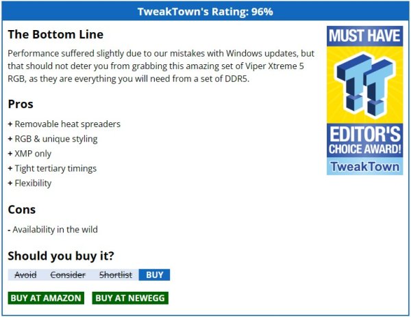 Tento kit Patriot Viper Xtreme 5 RGB 48 GB 7600 MT/s (2× 24 GB) získal ocenenie: