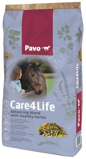 Pavo Care4Life obsahuje všetko, čo z hľadiska výživy môžeme na podporu zdravia vášho koňa vziať do úvahy. Toto mimoriadne krmivo sa skladá okrem iného zo surovín bohatých na vlákninu, mastných kyselín omega 3 a 6, pre- a probiotík, kvasníc, 11 rôznych bylín*, vitamínov a minerálov v organickej forme.