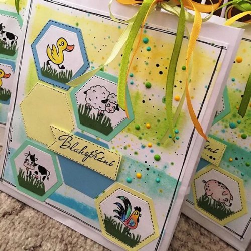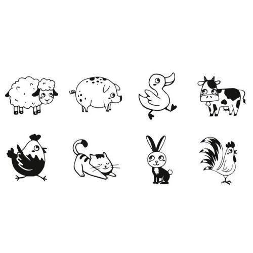 Sada 8 detských pečiatok s motívmi zvierat z farmy a pečiatkový vankúšik čiernej farby.