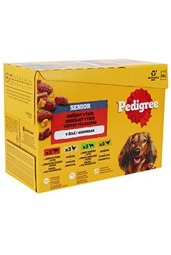 Kompletné vlhké krmivo pre staršie psy. Váš pes si pochutí na štyroch príchutiach, zmiešaný výber v želé so zmesou hovädzieho a pečene, s kuracím, so zmesou jahňacieho a pečene, s hydinou.