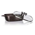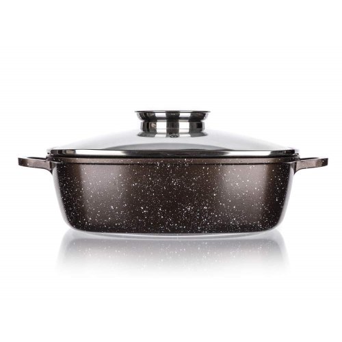 Tento liaty hliníkový pekáč sa pýši nepriľnavým vnútorným povrchom a žiaruvzdorným nástrekom v mramorovej štruktúre , ktorý pokrýva dokonca aj indukčné dno. Veľkou výhodou je tiež možnosť použitia do rúry , a to aj so sklenenou pokrievkou s hliníkovou arómou knobom . Ten vám umožňuje počas pečenia dolievať otvorom tekutiny bez toho, aby ste museli zdvíhať pokrievku.